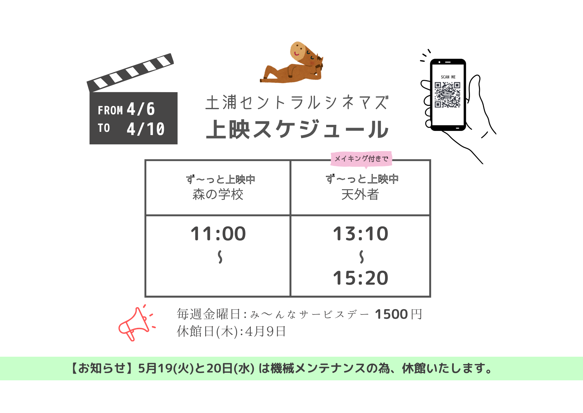 上映スケジュール 3/14-4/3 4/4-4/5 4/6-4/10 4/11-4/24 当館で映画をご覧いただくお客様への 上映前後の待合スペースとさせていただいており 映画鑑賞の予定のない方の入館はできませんので ご遠慮くださいますようお願いいたします。 共有:Tweetいいね 読み込み中…